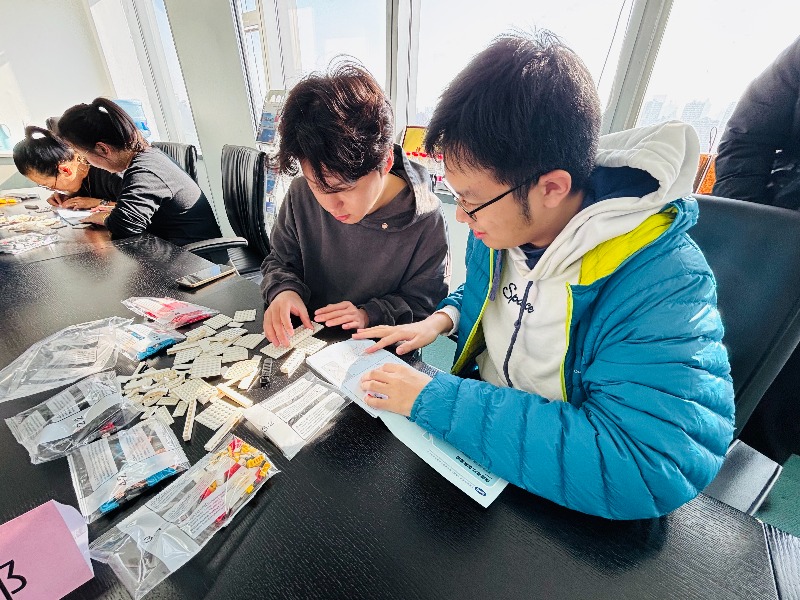操作部与市场部、港口部与海外部两两比拼,跨部门组合迅速形成作战单元。比赛一开始,操作部员工便蹲身比对零件图纸,轻声与同伴商量:“你先把底座框架零件归拢,我来核对型号。”港口部同事则指着岸吊吊臂部件,和同伴沟通:“这个卡扣得卡紧,咱俩一人扶一端,同步发力更稳。”现场没有杂乱喧闹,只有低声商讨与默契配合,清点零件时的眼神确认,搭建框架时的手势呼应,每一个分工细节都透着团队协作的温度,让组装效率大幅提升。