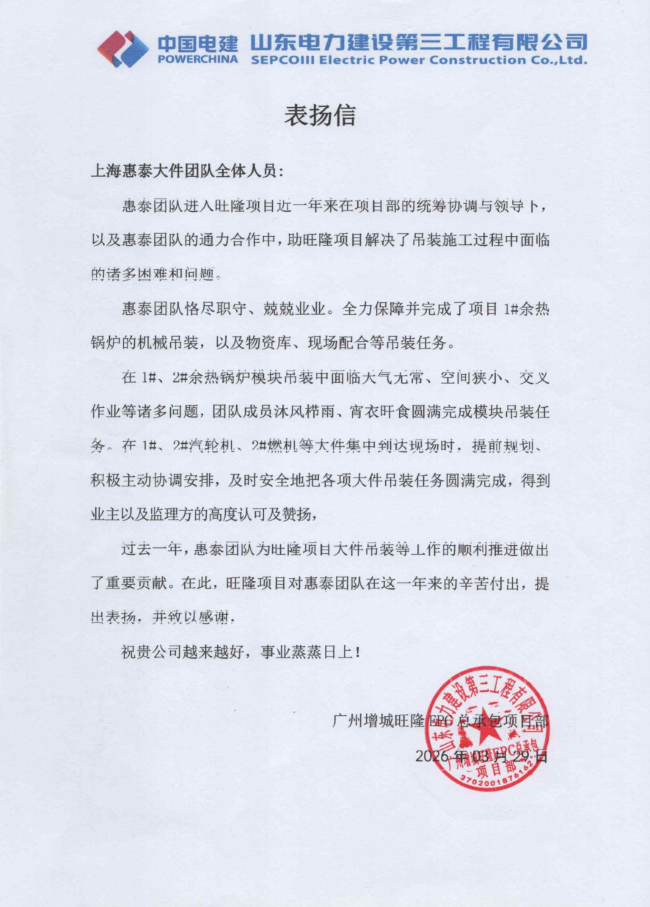 未来,鸿运供应链公司将以此次荣誉为契机,持续深耕大件吊装核心业务,不断提升项目管理水平与服务质量,以更饱满的热情、更务实的作风,为客户创造更大价值,为行业发展贡献惠泰力量,奋力书写公司高质量发展的新篇章!