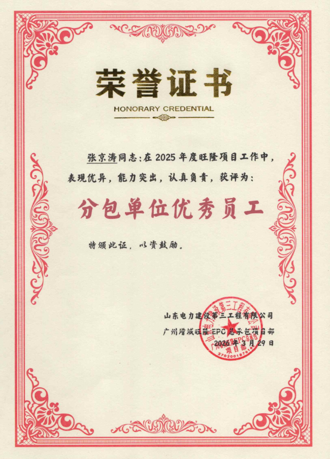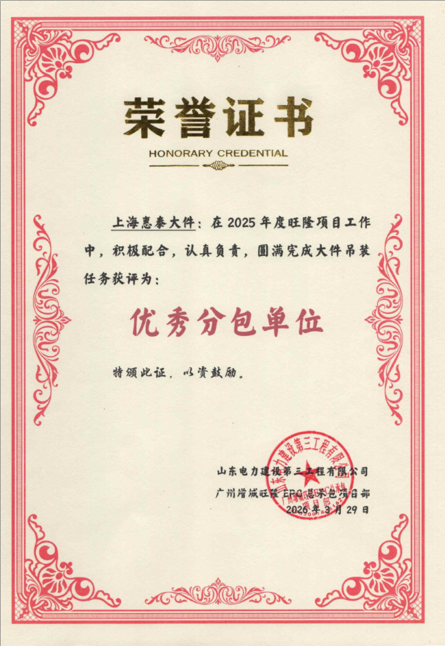 近日,鸿运供应链公司大件事业部吊装团队收到来自山东电力建设第三工程有限公司广州增城旺隆EPC 总承包项目部的表扬信,并被授予 2025 年度 “优秀分包单位” 荣誉称号,张京涛获评“分包单位优秀员工”。这是业主方对我司吊装团队专业能力、责任担当与服务品质的高度认可,更是对公司大件吊装业务实力的有力印证。